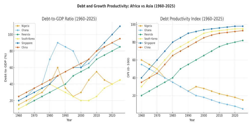 The trajectory of Africa’s giants (Nigeria, Ghana, and Egypt) contrasts sharply with that of Rwanda which, despite its vulnerabilities, has deployed debt more strategically, and with Asian success stories (South Korea, Singapore, and China), where disciplined investment transformed debt liabilities into engines of growth. Rwanda’s debt-to-GDP ratio rose from about 20% in 2010 to over 80% in 2025, triggering a Fitch downgrade. Yet unlike Nigeria, much of Rwanda’s borrowing has been channelled into infrastructure, health, and technology, underpinned by long-term national planning and relatively strong governance. The contrast is therefore stark: while Africa’s giants struggle with rising debt and limited returns, Rwanda and Asia’s success stories demonstrate that, under the right conditions, borrowing can be turned into a driver of growth.