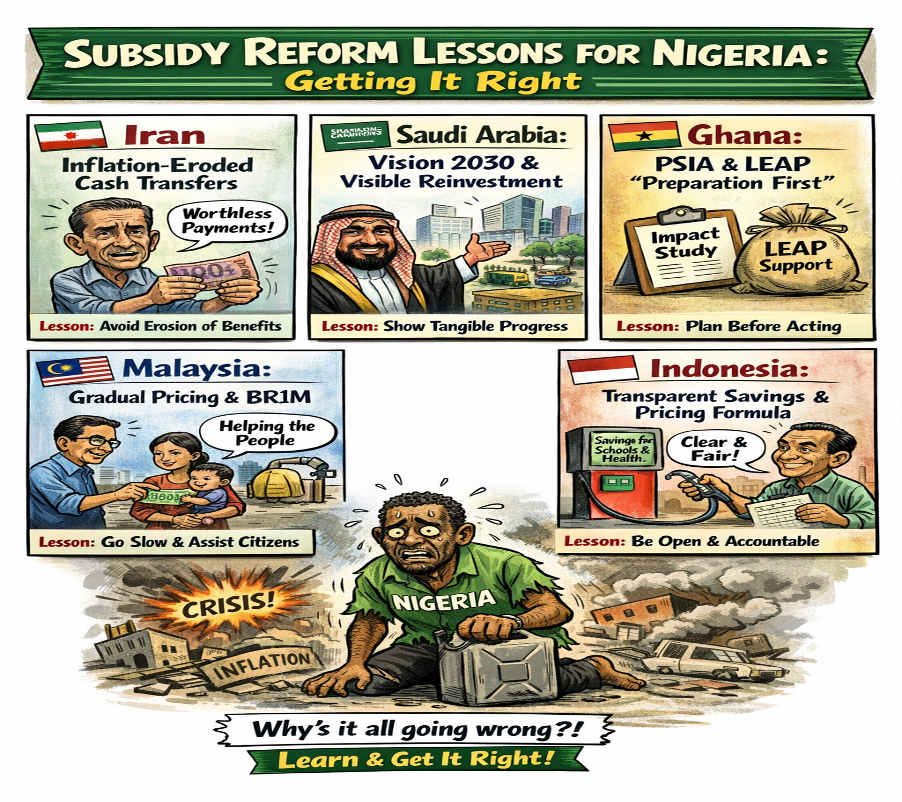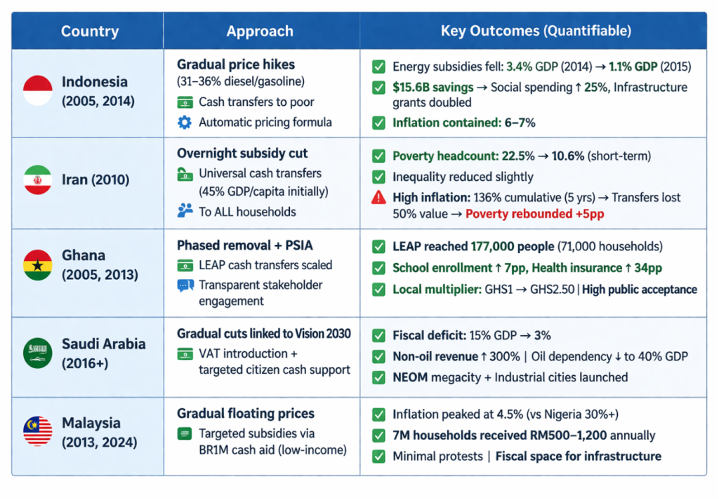 Iran, Saudi Arabia, Ghana, Malaysia, and Indonesia are resource-rich, emerging or middle-income economies that once sustained large subsidies and faced similar fiscal pressures around energy subsidies like Nigeria.