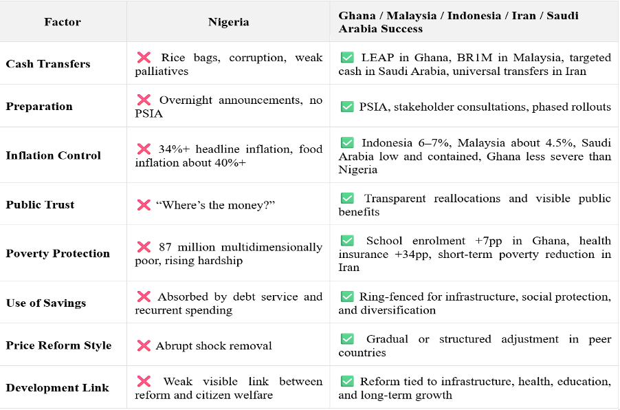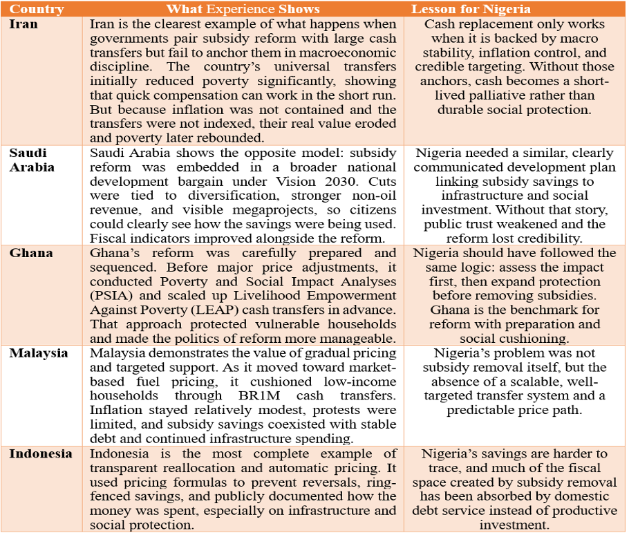 While most peer countries achieved stronger post‑subsidy reform outcomes due to effective preparation, targeted & scalable compensation, and clear reinvestment, Nigeria, by contrast, removed subsidies without an effective roadmap, rather, relying on ad‑hoc palliatives that neither cushioned the shock nor built public trust.