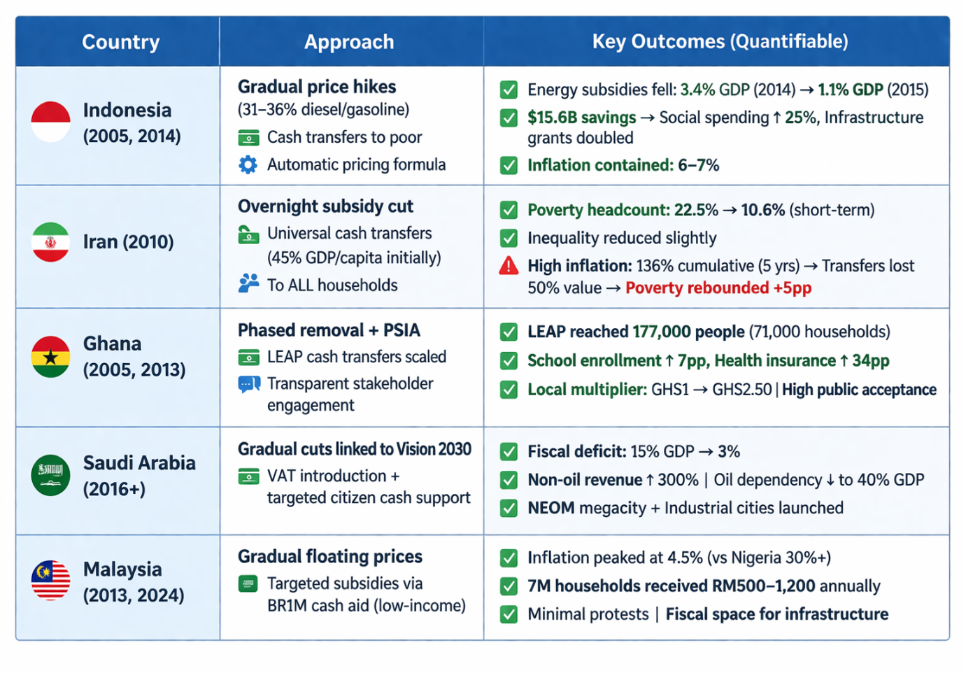 Indonesia phased fuel price hikes, and cut energy subsidies from 3.4% of GDP in 2014 to 1.1% in 2015. Iran’s overnight removal briefly reduced poverty before inflation eroded gains in 5 years. Ghana used Poverty and Social Impact Analysis and expanded Livelihood Empowerment Against Poverty (LEAP) as a cushion for households. Saudi Arabia tied gradual cuts to Vision 2030, targeted cash support, and large-scale industrial development, including the NEOM megacity. Malaysia floated prices gradually while protecting low‑income households and preserving fiscal space.